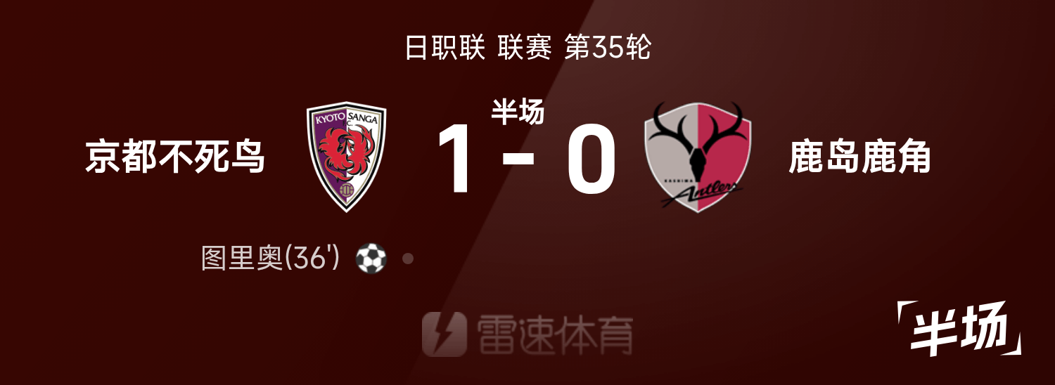 日职联半场:图里奥破门,京都不死鸟暂1-0鹿岛鹿角