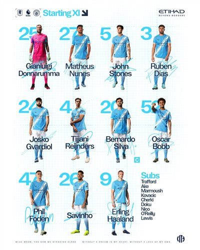 曼城首发阵容:25-多纳鲁马、5-斯通斯、3-迪亚斯、27-努内斯、24-格瓦迪奥尔、20-B席、47-福登、4-赖因德斯、26-萨维尼奥、52-鲍伯、9-哈兰德
