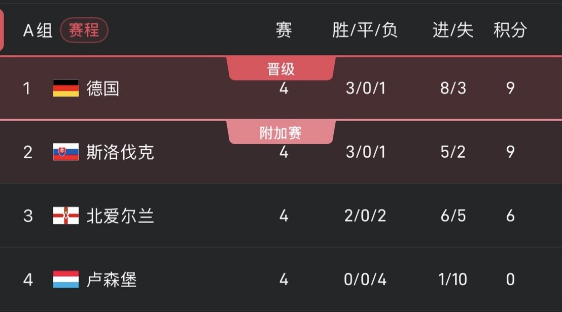 德国与斯洛伐克同积9分,他们将在最后一轮直接对话。在此之前,两队还需分别对阵卢森堡和北爱尔兰。