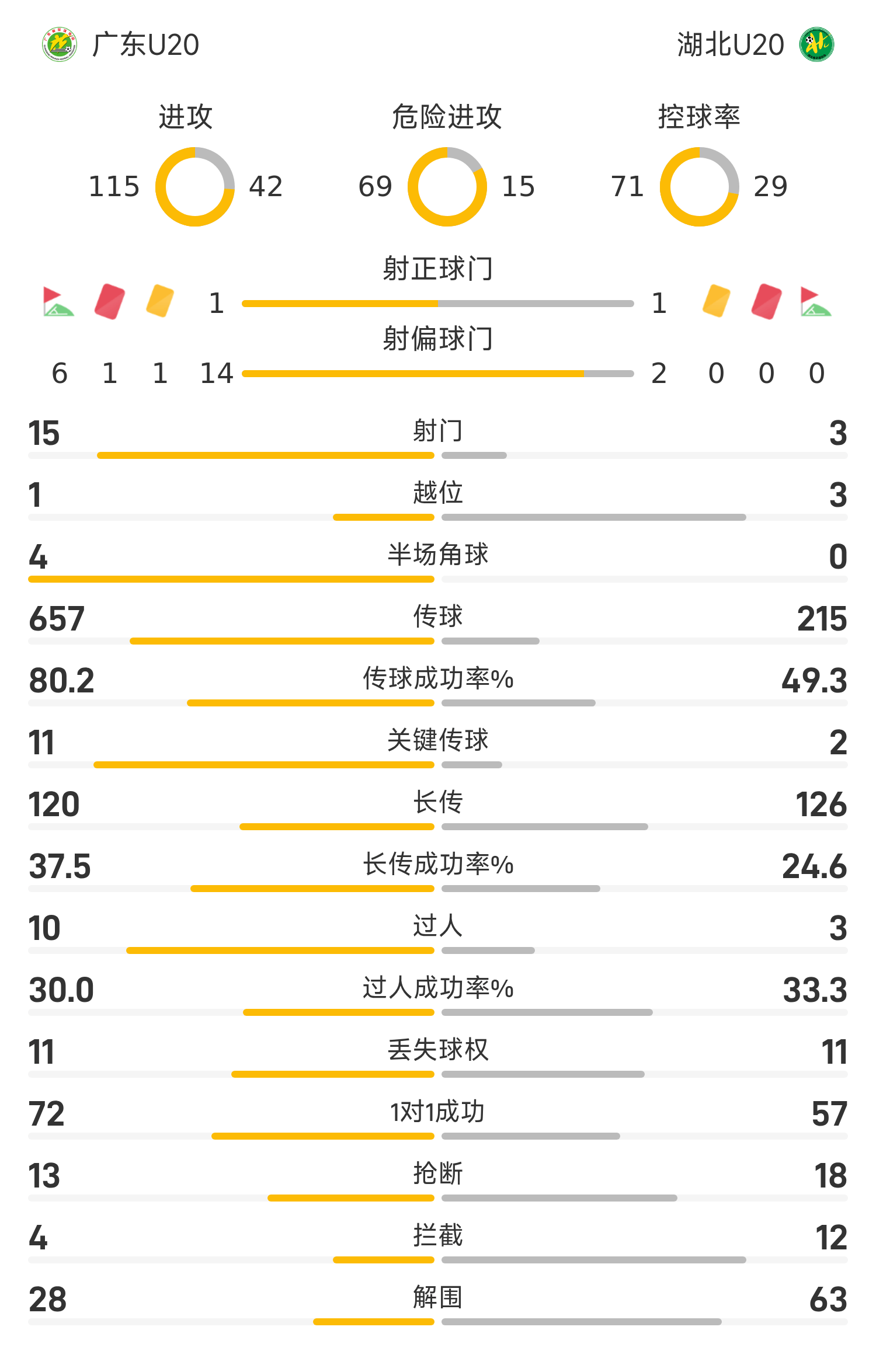 湖北U20首发阵容:1-姚浩洋、34-王康(90’25-于景澄)、11-韦所为(46’19-韦子弦)、5-余田乐、2-孙康博、16-杨希、6-夏子豪、10-范绪林(96’8-高速)、18-熊继政、15-姜利勋(82’14-杨博雯)、13-黄开俊(67’21-王智诚)