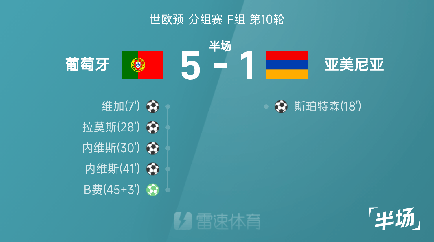世欧预半场:内维斯双响,B费点射,葡萄牙5-1亚美尼亚