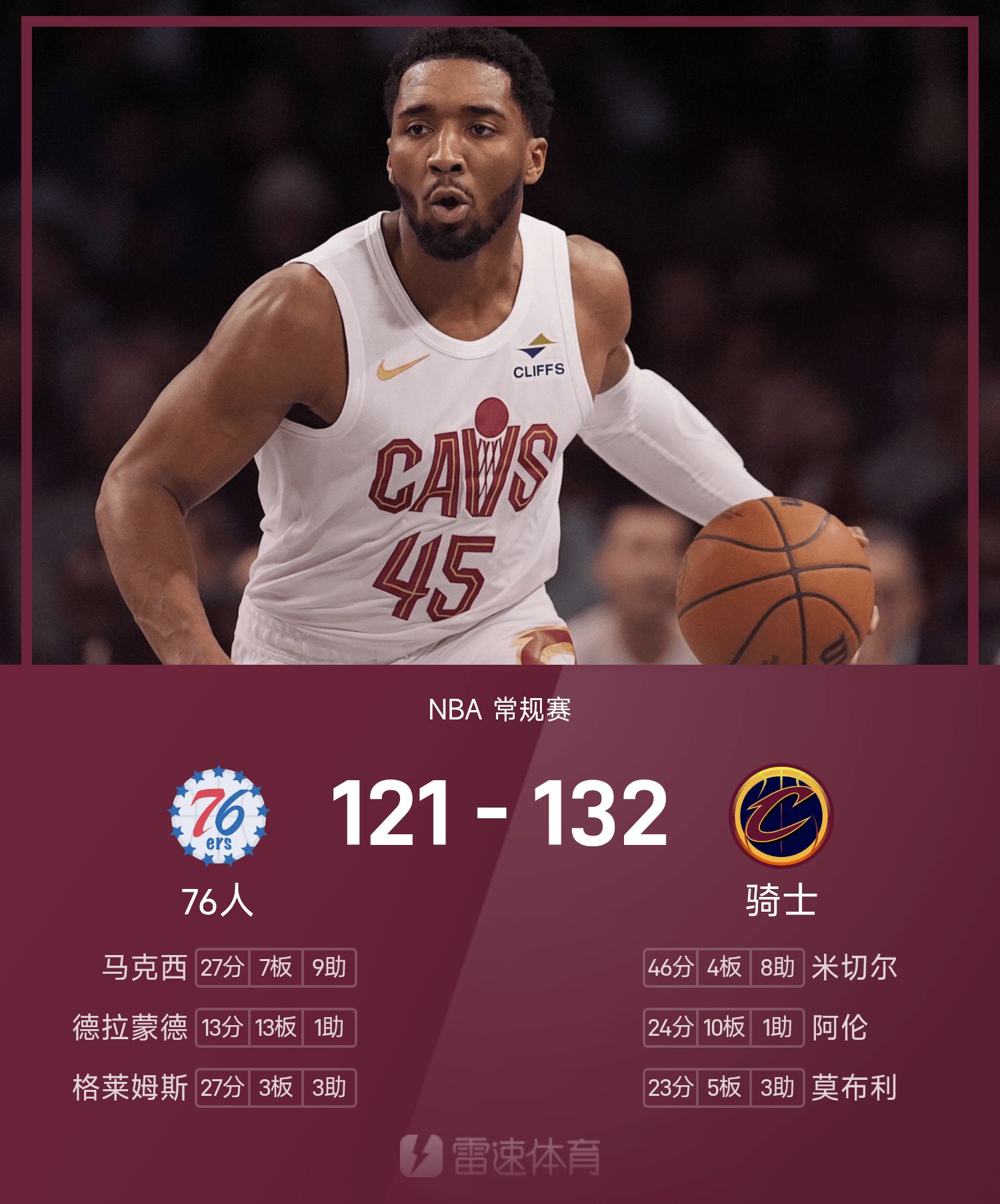 NBA战报:米切尔46分8助,骑士132-121击败76人