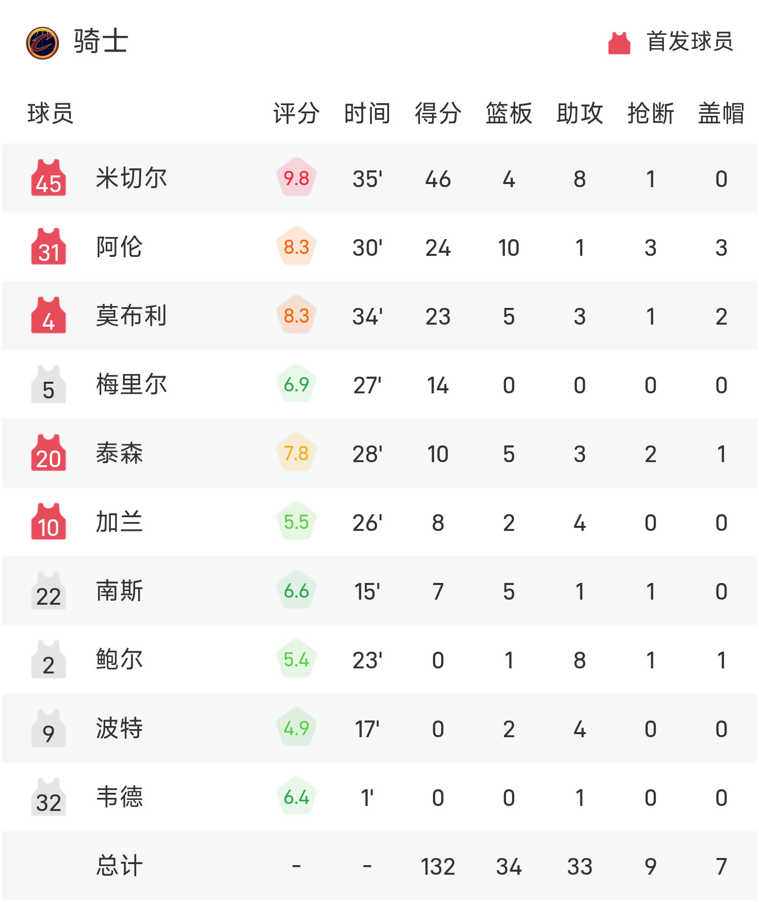 双方全场战罢,骑士132-121战胜76人。