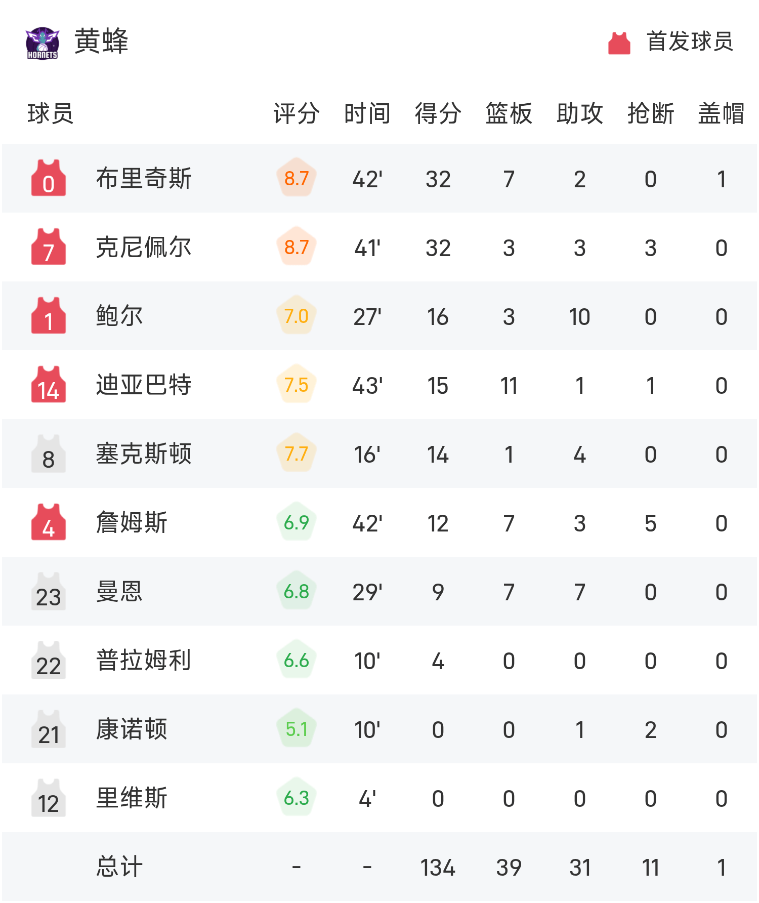 6686体育11月15日讯 25/26赛季NBA 常规赛 NBA杯分组赛,雄鹿对阵黄蜂。双方全场战罢,雄鹿147-134战胜黄蜂。库兹马得到29分10板5助率队取胜,布里奇斯空砍全场最高的32分7板2助。