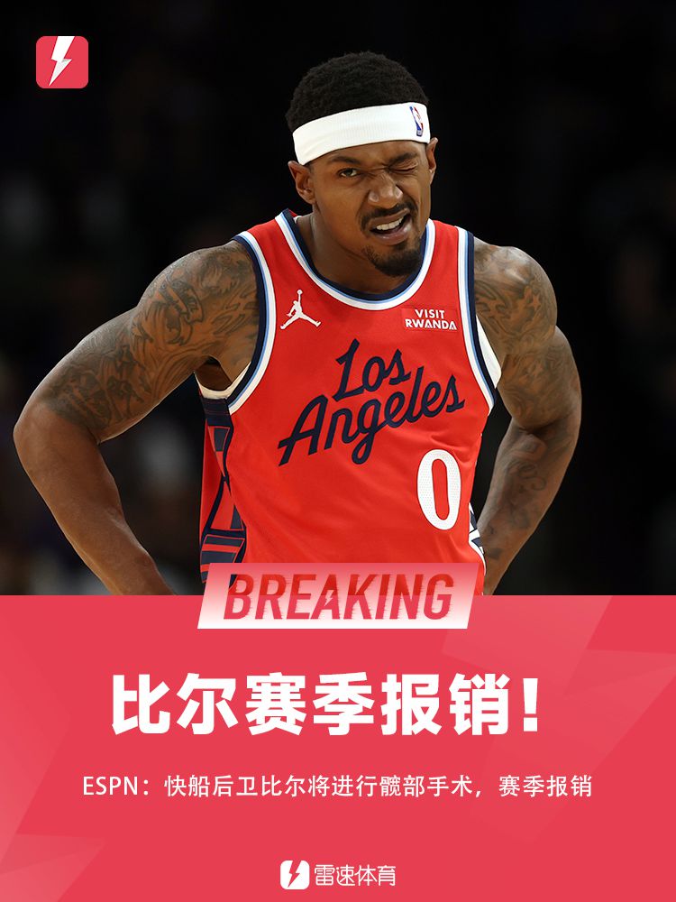 6686体育11月13日讯 今日,据ESPN名记Shams报道,快船后卫比尔遭遇髋部骨折将进行手术,赛季报销。