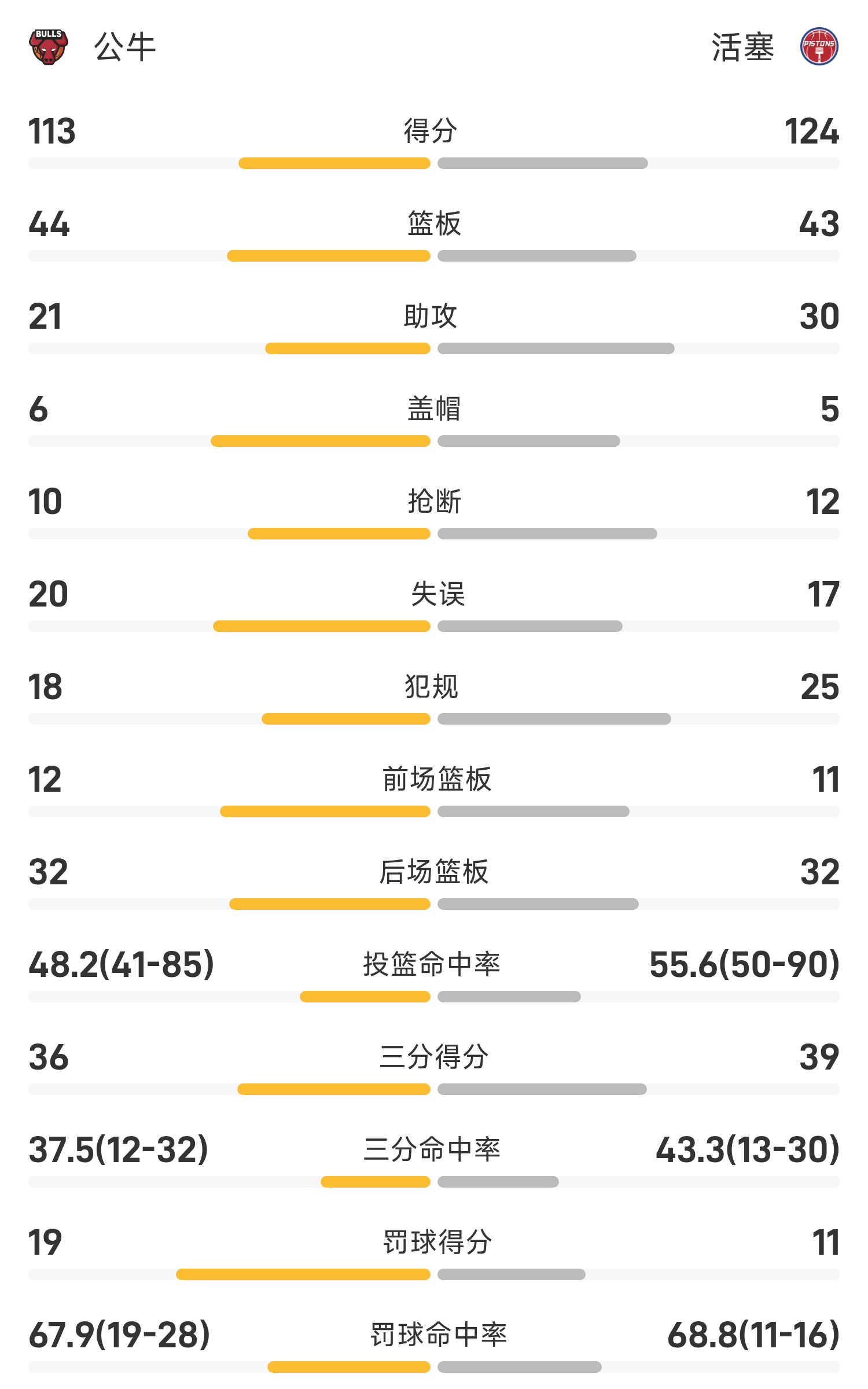 双方全场战罢,活塞124-113战胜公牛。