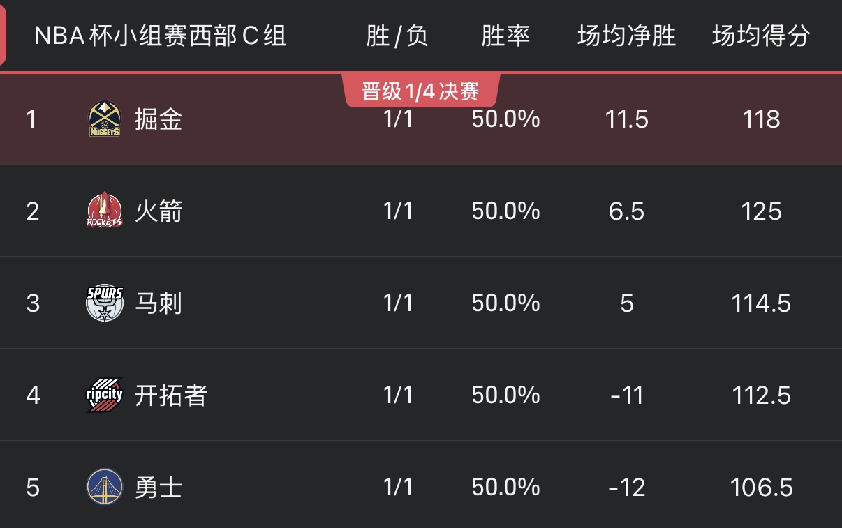 NBA杯即时排名:多队取得2胜0负,西部C组5队均1胜1负