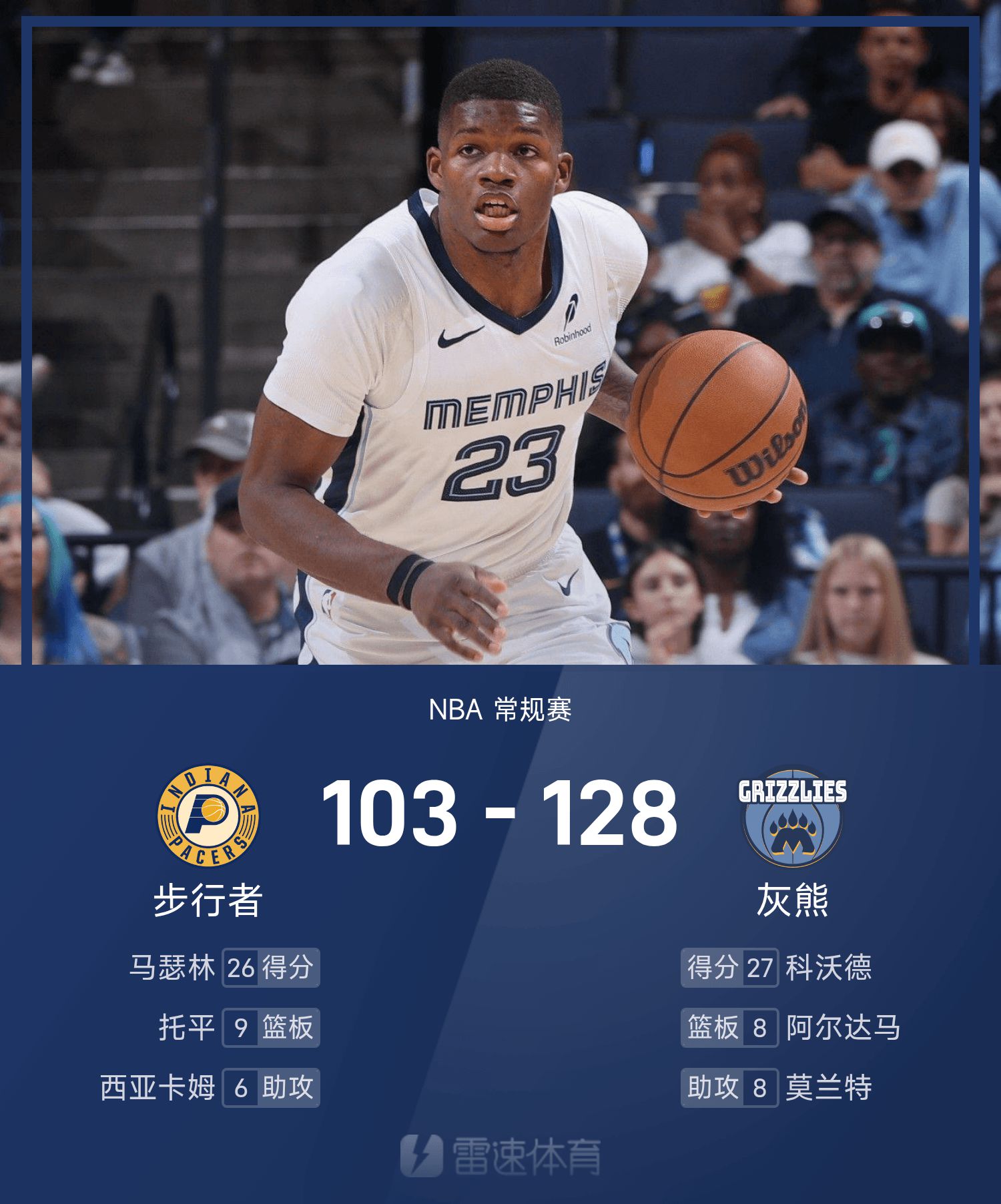 雷霆内线切特·霍姆格伦命中6记三分球球,得到31分12抢篮板3截球;雷霆核心亚历山大仅凭4次罚篮,即得到30分4抢篮板5助攻。雷霆凭借双星闪耀表现,开赛季喜提三连胜。