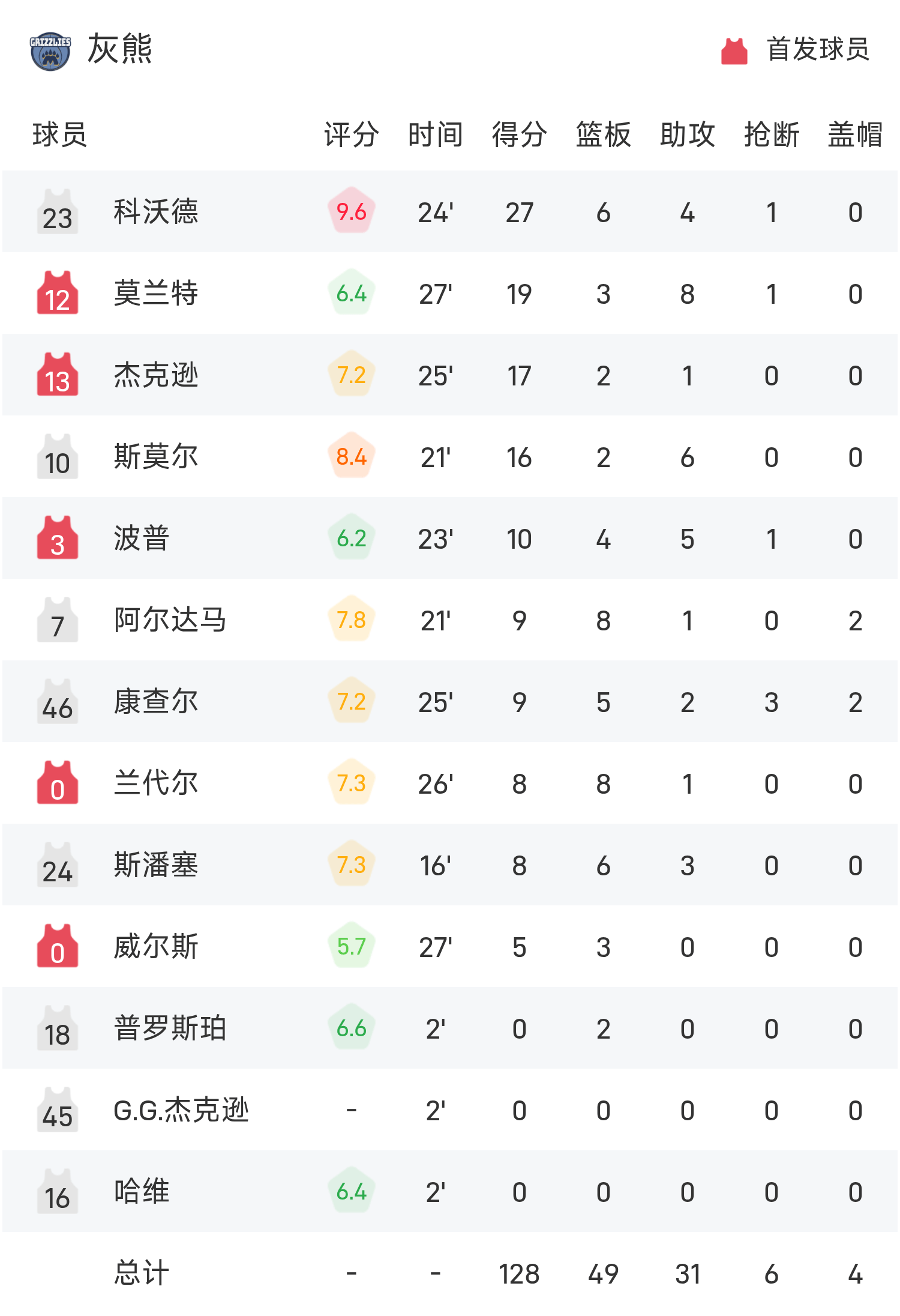 科沃德砍下全场最高的27分6板4助,率领灰熊胜利取胜。