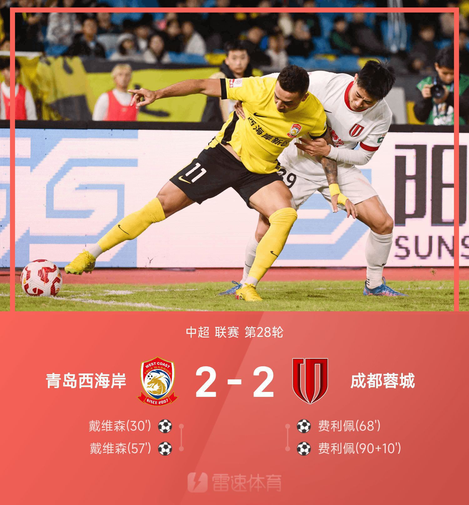 中超战报:费利佩双响+读秒绝平,青岛西海岸2-2成都蓉城
