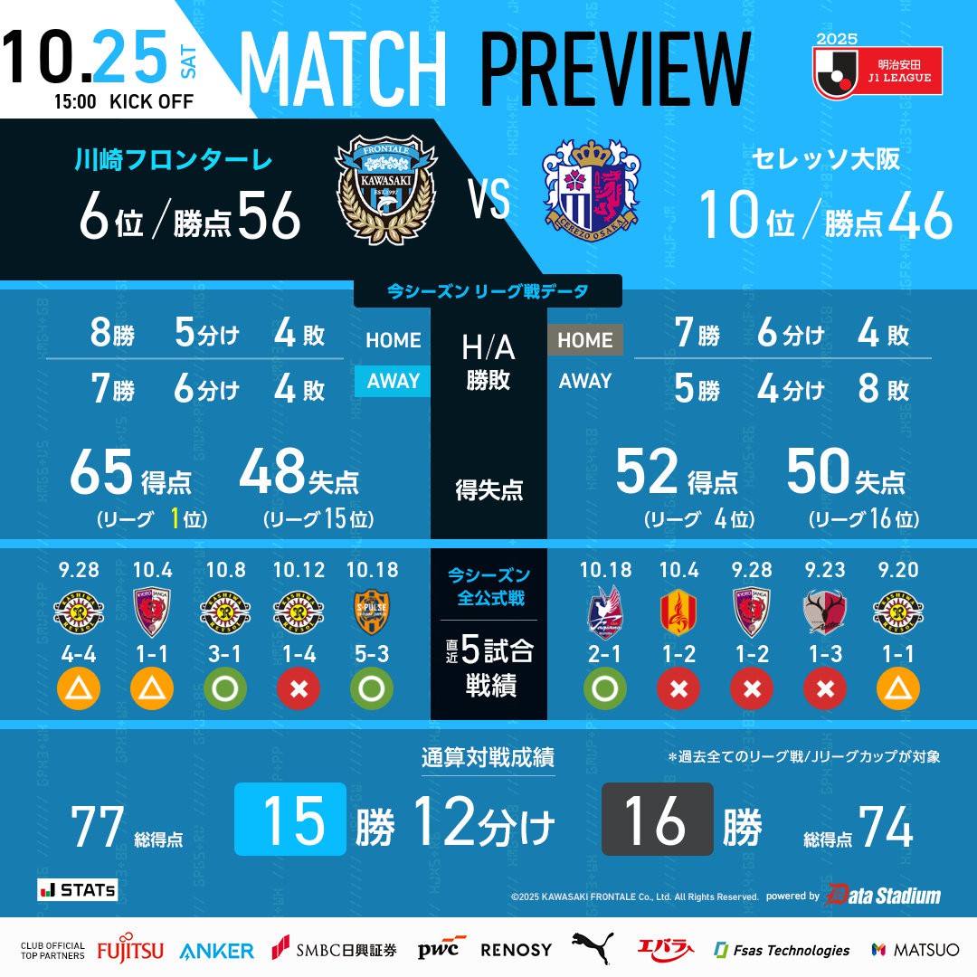 6686体育10月25日讯 日职联第35轮,大阪樱花主队场迎战川崎前锋。
