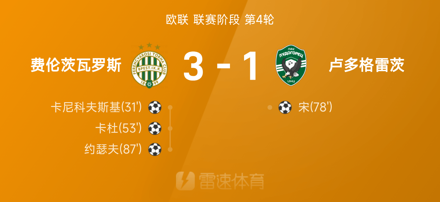 6686体育11月07日讯 25/26赛季欧联联赛事阶段第4轮,费伦茨瓦罗斯3-1战胜卢多格雷茨。全场竞赛,卡杜、约瑟夫、卡尼科夫斯基破门建功,宋破门难救主。