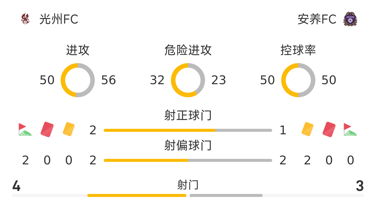 光州FC首发阵容:1-金耿民、94-沉相旼、5-卞俊洙、2-赵诚权、20-进时宇、10-崔庆绿、18-朴仁赫、8-李刚玹、16-郑支训、17-雷斯、40-申昶武