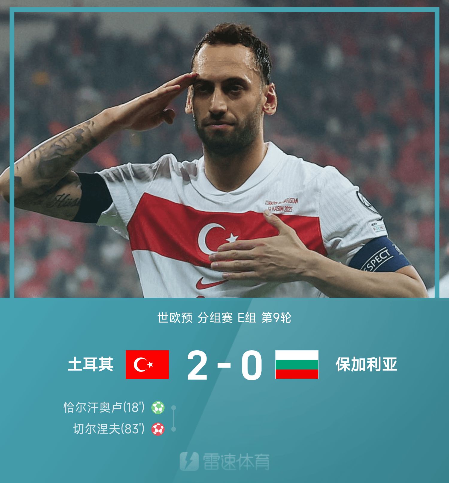 6686体育11月16日讯 26赛季世欧预分组赛E组第9轮,土耳其2-0战胜保加利亚。上半场竞赛,恰尔汗奥卢点射破门,下半场切尔涅夫自摆乌龙,协助土耳其力克对手。
