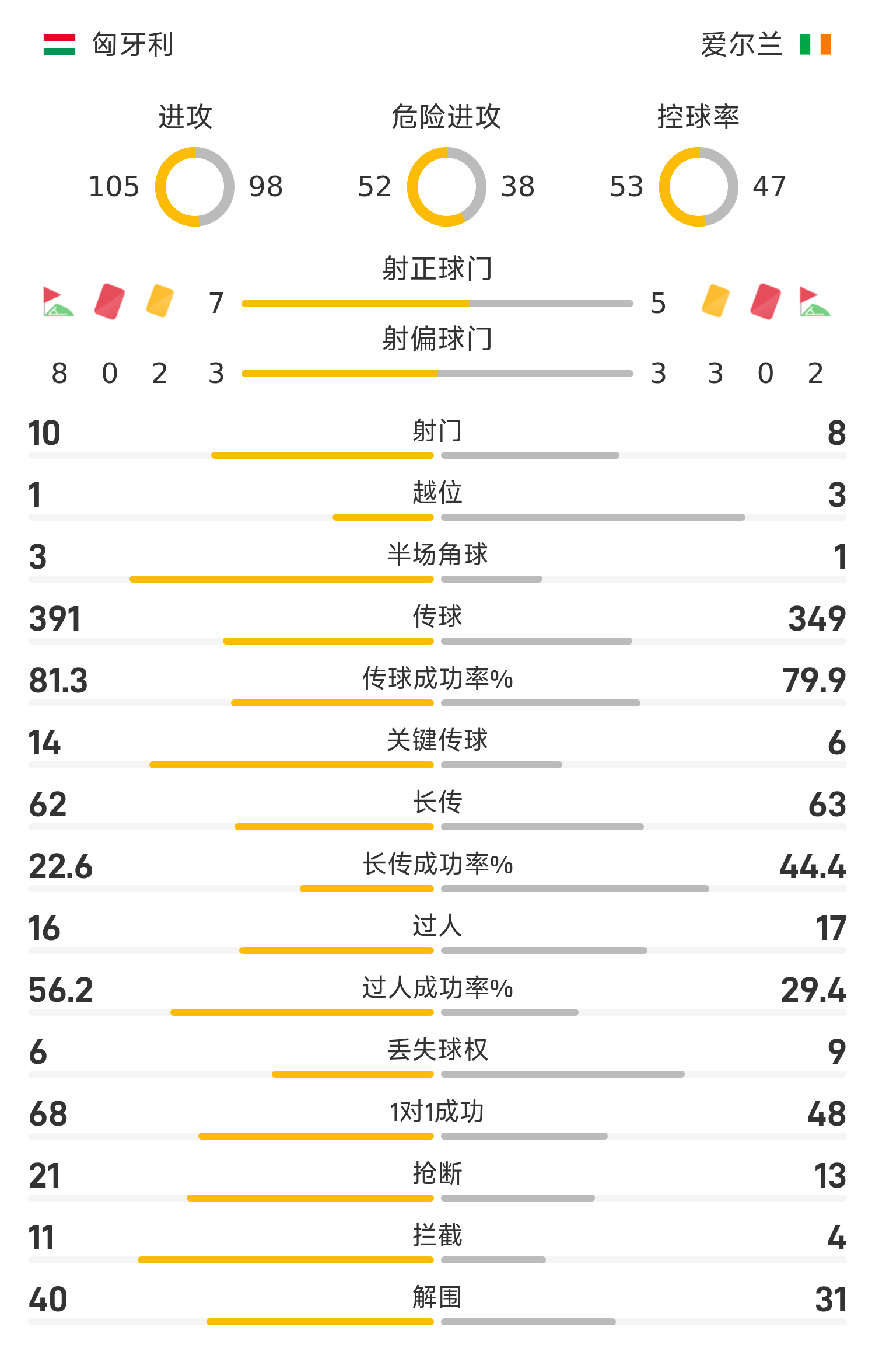 匈牙利首发阵容:1-迪布茨、7-内戈(90’2-莫西)、6-奥尔班、4-绍洛伊、11-凯尔凯兹、20-萨莱(90’23-雷迪奇)、10-索博斯洛伊、13-舍弗(63’5-奥特沃斯)、16-卢卡奇(63’17-斯泰尔斯)、21-托斯(76’14-博拉)、19-瓦尔加