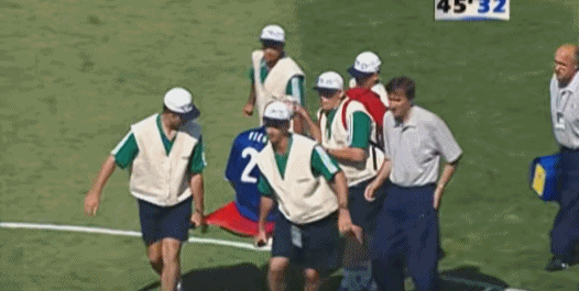 上半场补时阶段,卡纳瓦罗冒着受伤的风险,将皮球顶出端线。
