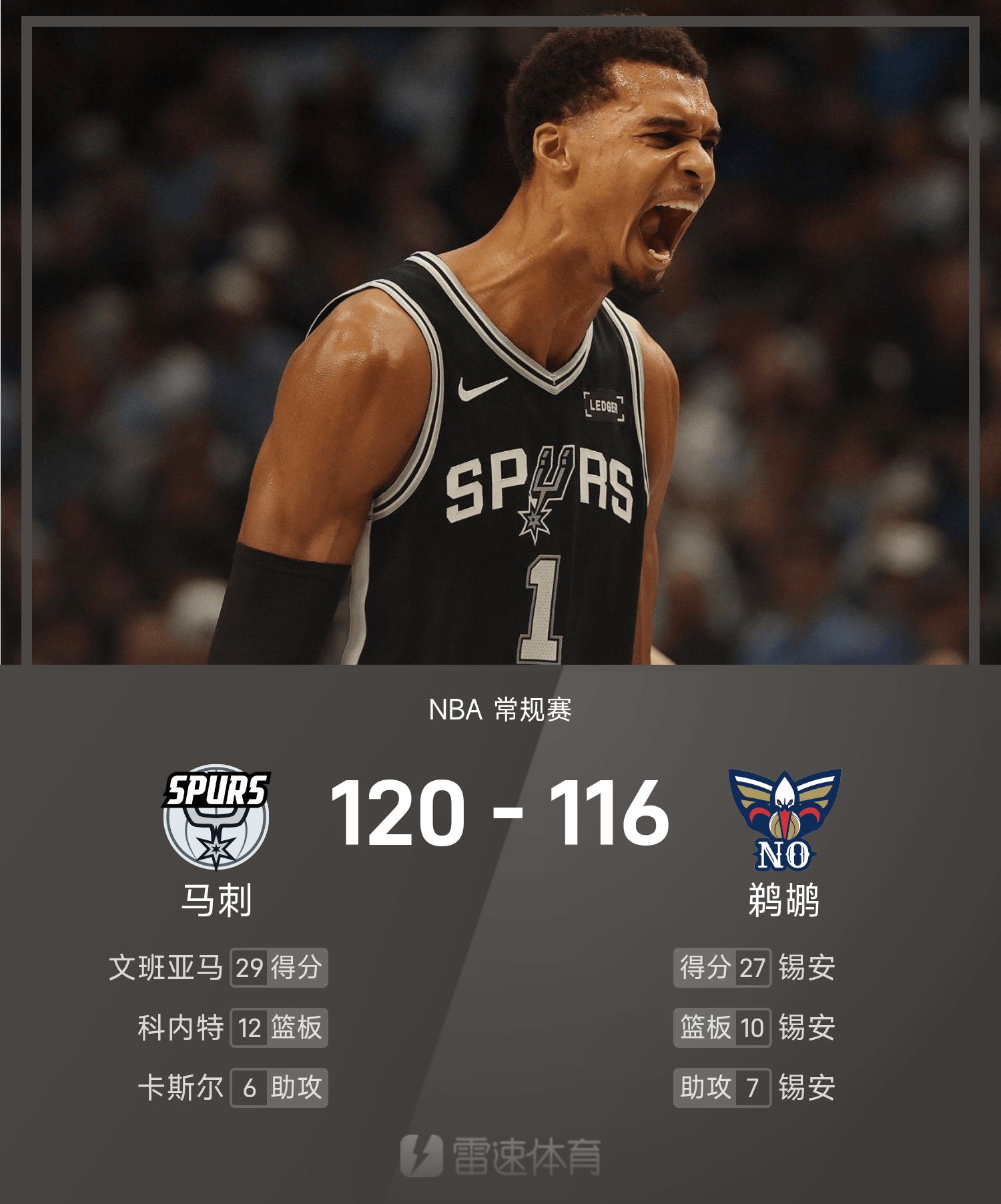 NBA战报:文班亚马29分9帽,马刺120-116延长赛险胜鹈鹕